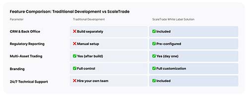 ALT: Feature comparison: Traditional brokerage development vs ScaleTrade White Label Platform